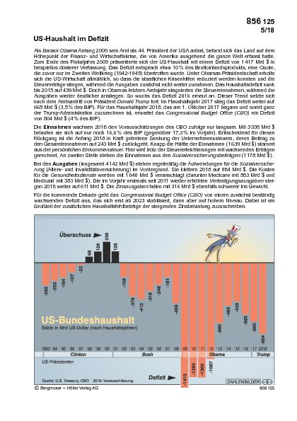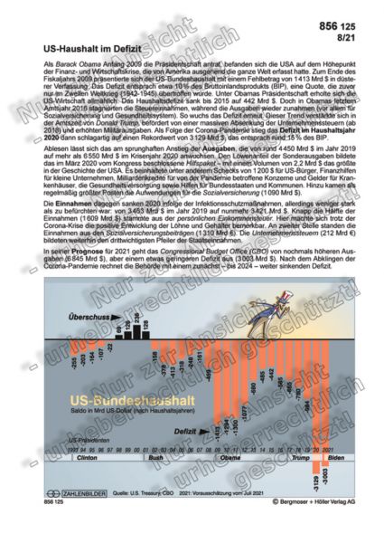 Als Barack Obama Anfang 2009 die Präsidentschaft antrat, befanden sich die USA auf dem Höhepunkt der Finanz- und Wirtschaftskrise, die von Amerika ausgehend die ganze Welt erfasst hatte. Zum Ende des Fiskaljahrs 2009 präsentierte sich der US-Bundeshaushalt mit einem Fehlbetrag von 1 413 Mrd $ in düsterer Verfassung. Das Defizit entsprach etwa 10 % des Bruttoinlandsprodukts (BIP), eine Quote, die zuvor nur im Zweiten Weltkrieg (1942-1945) übertroffen wurde. Unter Obamas Präsidentschaft erholte sich die US-Wirtschaft allmählich. Das Haushaltsdefizit sank bis 2015 auf 442 Mrd $. Doch in Obamas letztem Amtsjahr 2016 stagnierten die Steuereinnahmen, während die Ausgaben wieder zunahmen (vor allem für Sozialversicherung und Gesundheitssystem). So wuchs das Defizit erneut. Dieser Trend verstärkte sich in der Amtszeit von Donald Trump, befördert von einer massiven Absenkung der Unternehmenssteuern (ab 2018) und erhöhten Militärausgaben. Als Folge der Corona-Pandemie stieg das Defizit im Haushaltsjahr 2020 dann schlagartig auf einen Rekordwert von 3 129 Mrd $, das entsprach rund 15 % des BIP.