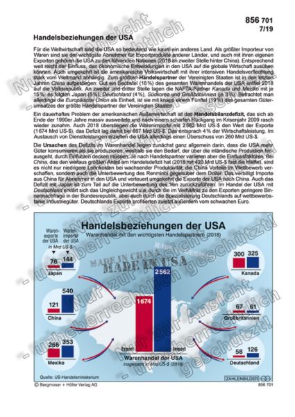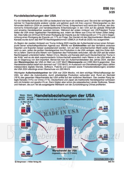 Zu Beginn der zweiten Amtszeit von Trump Anfang 2025 machte der Außenhandel erneut einen Schwerpunkt seiner wirtschaftspolitischen Agenda aus. Mithilfe von Einfuhrzöllen soll das Verhältnis zwischen Importen und Exporten besser ausbaslanciert werden. Um auf dem amerikanischen Markt weiter erfolgreich zu sein, sollen die großen Handelspartner ihre Produktion in die USA verlegen, statt ihre Güter dorthin zu liefern. Damit ist eine Abkehr vom Gedanken des Freihandels verbunden, den die USA seit der ersten Nachkriegszeit unterstützt hatten. Neben China, Mexiko und Kanada steht auch Deutschland bei Trump in der Kritik, weil es als stark exportorientierte Volkswirtschaft wesentlich mehr Waren in die USA liefert, als sie im Gegenzug von dort importiert. Betrachtet man die Außenhandelsdaten des Jahres 2024, standen den Warenimporten der USA im Wert von 3 267 Mrd $ Warenexporte von 2 065 Mrd $ gegenüber. Das Handelsbilanzdefizit belief sich demnach auf 1 202 Mrd $. Im Austausch von Dienstleistungen (dazu zählen insbesondere digitale Dienste, Software, Patente und Lizenzen sowie Finanzdienstleistungen) erzielten die USA 2024 allerdings einen Überschuss von 293 Mrd $.