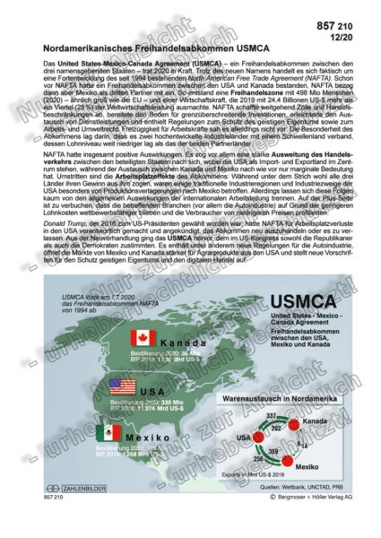 Das United States-Mexico-Canada Agreement (USMCA) – ein Freihandelsabkommen zwischen den drei namensgebenden Staaten – trat 2020 in Kraft. Trotz des neuen Namens handelt es sich faktisch um eine Fortentwicklung des seit 1994 bestehenden North American Free Trade Agreement (NAFTA). Schon vor NAFTA hatte ein Freihandelsabkommen zwischen den USA und Kanada bestanden, NAFTA bezog dann aber Mexiko als dritten Partner mit ein. So entstand eine Freihandelszone mit 498 Mio Menschen (2020) – ähnlich groß wie die EU – und einer Wirtschaftskraft, die 2019 mit 24,4 Billionen US-$ mehr als ein Viertel (28 %) der Weltwirtschaftsleistung ausmachte. NAFTA schaffte weitgehend Zölle und Handelsbeschränkungen ab, bereitete den Boden für grenzüberschreitende Investitionen, erleichterte den Austausch von Dienstleistungen und enthielt Regelungen zum Schutz des geistigen Eigentums sowie zum Arbeits- und Umweltrecht. Freizügigkeit für Arbeitskräfte sah es allerdings nicht vor. Die Besonderheit des Abkommens lag darin, dass es zwei hochentwickelte Industrieländer mit einem Schwellenland verband, dessen Lohnniveau weit niedriger lag als das der beiden Partnerländer.