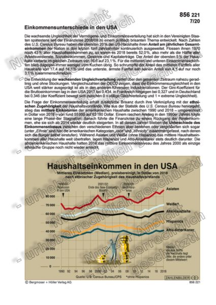 Die Frage der Einkommensverteilung erhält zusätzliche Brisanz durch ihre Verknüpfung mit der ethnischen Zugehörigkeit der Haushaltsvorstände. Wie aus der Statistik des U.S. Census Bureau hervorgeht, stieg das mittlere Einkommen der amerikanischen Haushalte zwischen 1990 und 2018 –umgerechnet in Dollar von 2018 – von rund 55950 auf 63180 Dollar. Einem raschen Anstieg in den 1990er Jahren folgte eine lange Phase der Stagnation; danach führte die Finanzkrise zu einem Rückgang der Realeinkommen, ehe sie sich ab 2014 wieder deutlich steigerten. In all diesen Jahren blieben die Unterschiede des Einkommensniveaus zwischen den verschiedenen Ethnien aber bestehen oder vergrößerten sich sogar (unter „Ethnie“ sind hier die amerikanischen Kategorien „race“ und „ethnicity“ zusammengefasst, nach denen sich die Bürger selbst einstufen). Während Asiaten und Weiße (ohne Hispanics) das mittlere Haushaltseinkommen aller Haushalte weit übertrafen, lagen Hispanics und Afro-Amerikaner stets deutlich darunter. Die afroamerikanischen Haushalte hatten 2018 das mittlere Einkommensniveau des Jahres 2000 als einzige ethnische Gruppe noch nicht wieder erreicht.