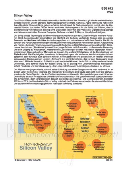 Der Erfolg dieses Technologie- und Innovationszentrums beruht auf dem Zusammenspiel mehrerer Faktoren. Dank hervorragender Universitäten wie Stanford und Berkeley verfügt die Region über ein großes Potenzial an Nachwuchskräften im technologischen und naturwissenschaftlichen Bereich. Die Hochschulen und Forschungseinrichtungen unterstützen ihre hochqualifizierten Absolventen bei der Ausgründung von Firmen, durch die Forschungsergebnisse und Erfindungen in Geschäftsideen umgesetzt werden. Sogenannte Inkubatoren („Brutkästen“) unterstützen junge Gründer mit Infrastruktur, professioneller Betreuung und dem Zugang zu Netzwerken. Akzeleratoren („Beschleuniger“) helfen mit zeitlich begrenzten Förderprogrammen, Ideen schnell zur Marktreife zu bringen. Ein weiterer Erfolgsfaktor ist die Bereitstellung von Risikokapital. Die Kapitalgeber investieren in Neugründungen, die ein hohes Wachstumspotenzial versprechen, aber durchaus auch scheitern können. Fehlinvestitionen sind einkalkuliert, im Idealfall entwickelt sich aus dem Startup aber ein Unicorn („Einhorn“), d.h. ein Unternehmen, das vor dem Börsengang einen Wert von 1 Milliarde $ erreicht. Schließlich spielt auch das Mindset, die im Silicon Valley vorherrschende Denkweise, eine zentrale Rolle für dessen Erfolg. Es ist geprägt von Unternehmergeist, Risikobereitschaft, Flexibilität und der Überzeugung, das Leben mithilfe neuer Technologien erleichtern zu können.