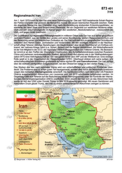 Die Qualifikation zur regionalen Führungsmacht im mittleren Orient leitet der Iran aus seiner geopolitisch zentralen Position, aus der Größe des Landes und seiner Bevölkerung, seinem Ressourcenreichtum und der Bedeutung seiner (vor)islamischen Zivilisation ab. Der Iran befindet sich im geografischen Schnittpunkt zwischen dem Nahen Osten, Zentralasien und Vorderindien. Mit den wichtigen Akteuren in der Nachbarschaft pflegt Teheran ständige Beziehungen; mit Saudi-Arabien aber ist ein Machtkampf um Einfluss entbrannt, der mehrere Kriege nährt (u.a. Syrien, Jemen) und die Region destabilisiert. Als Wirtschaftsmacht ist der Iran Mitglied in der ECO, der regionalen Wirtschaftsorganisation des mittleren Orients. Als Beobachter nimmt er an den Treffen der Shanghaier Organisation, des Sicherheitsbündnisses zwischen Russland, China und mehreren zentralasiatischen Staaten, teil und strebt dort ebenso wie in der Welthandelsorganisation WTO eine Vollmitgliedschaft an. Der Iran gehört ferner dem IWF und der Weltbank an. Eine wichtige Rolle spielt er in der Organisation der Ölexportstaaten OPEC. Überhaupt stützen sich seine außen- und wirtschaftspolitischen Ambitionen großenteils auf seine reichen Öl- und Gasvorkommen: Der Iran verfügt über die weltweit zweitgrößten Erdgasreserven, bei den Ölreserven belegt es den vierten Rang.