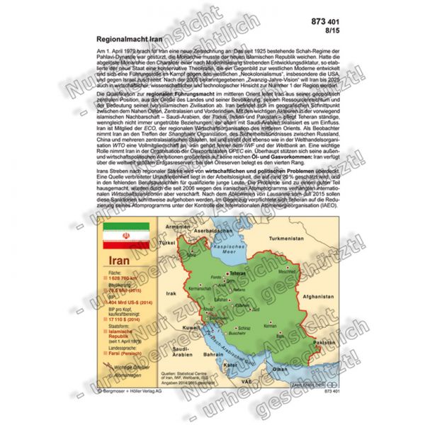 Am 1. April 1979 brach für den Iran eine neue Zeitrechnung an: Das seit 1925 bestehende Schah-Regime der Pahlavi-Dynastie war gestürzt, die Monarchie musste der neuen Islamischen Republik weichen. Hatte die abgelöste Monarchie den Charakter einer nach Modernisierung strebenden Entwicklungsdiktatur, so etablierte der neue Staat eine konservative Theokratie, die ein Gegenbild zur westlichen Moderne entwickelt und sich eine Führungsrolle im Kampf gegen den westlichen „Neokolonialismus“, insbesondere die USA, und gegen Israel zuschreibt.