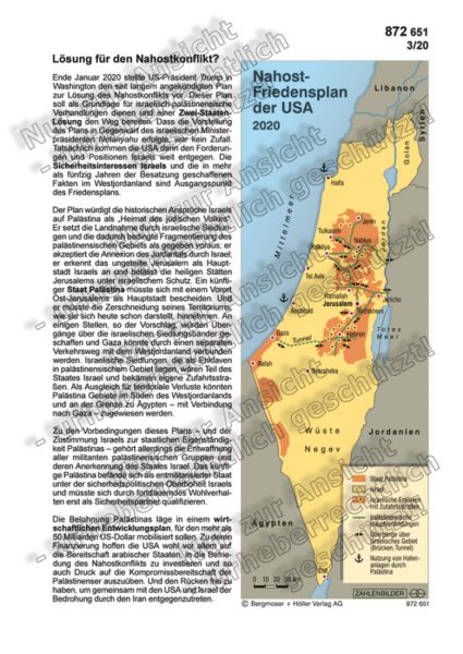 Ende Januar 2020 stellte US-Präsident Trump in Washington den seit langem angekündigten Plan zur Lösung des Nahostkonflikts vor. Dieser Plan soll als Grundlage für israelisch-palästinensische Verhandlungen dienen und einer Zwei-Staaten-Lösung den Weg bereiten. Dass die Vorstellung des Plans in Gegenwart des israelischen Ministerpräsidenten Netanyahu erfolgte, war kein Zufall. Tatsächlich kommen die USA darin den Forderungen und Positionen Israels weit entgegen. Die Sicherheitsinteressen Israels und die in mehr als fünfzig Jahren der Besatzung geschaffenen Fakten im Westjordanland sind Ausgangspunkt des Friedensplans.