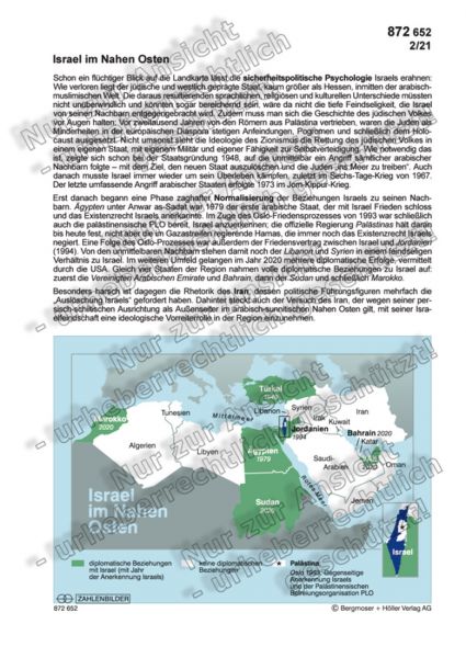 Besonders harsch ist dagegen die Rhetorik des Iran, dessen politische Führungsfiguren mehrfach die „Auslöschung Israels“ gefordert haben. Dahinter steckt auch der Versuch des Iran, der wegen seiner persisch- schiitischen Ausrichtung als Außenseiter im arabisch-sunnitischen Nahen Osten gilt, mit seiner Israelfeindschaft eine ideologische Vorreiterrolle in der Region einzunehmen.