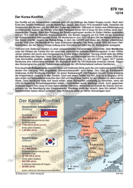 Der Konflikt auf der koreanischen Halbinsel geht auf die Anfänge des Kalten Krieges zurück. Nach dem Ende des Zweiten Weltkriegs und der Niederlage Japans, das Korea 1910 annektiert hatte, besetzten die Sowjetunion den Norden und die USA den Süden der Halbinsel. Während im Süden eine Militärregierung errichtet wurde, begann der Norden unter dem Partisanenführer Kim Il Sung mit dem Aufbau eines kommunistischen Staates. Nach dem Rückzug der Besatzungstruppen wurden im Süden Wahlen abgehalten und am 15.8.1948 die Republik Korea proklamiert. Der Norden reagierte am 9.9.1948 mit der Ausrufung der Demokratischen Volksrepublik Korea. Als Nordkorea im Juni 1950 mit dem Ziel der Wiedervereinigung den Süden überfiel, begann der Korea-Krieg, in dem die UdSSR und China den Norden unterstützten und die USA unter UN-Mandat an der Seite Südkoreas kämpften. Der Krieg endete 1953 mit einem Waffenstillstand, der die Teilung Koreas entlang einer Grenzlinie auf Höhe des 38. Breitengrads besiegelte.
