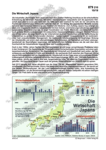 Als industrieller „Nachzügler“fand Japan erst nach dem Zweiten Weltkrieg Anschluss an die wirtschaftliche Entwicklung der führenden Nationen. Mit hohen Wachstumsraten katapultierte sich die japanische Wirtschaft dann aber in kurzer Zeit nach vorn: Ab 1968 nahm das Inselreich für mehr als vier Jahrzehnte die Position der zweitstärksten Wirtschaftsmacht der Welt ein. Der Erfolg des japanischen Modells beruhte auf einer eigentümlichen Verbindung von Tradition und Moderne: Zum Aufstieg Japans trug anfangs vor allem eine dirigistische staatliche Industriepolitik mit ihren Schutz- und Förderungsmaßnahmen zugunsten ausgewählter Exportbranchen bei. In enger Koordination von Politik, Bürokratie und Wirtschaft wurden auch größere Strukturveränderungen mit erstaunlicher Anpassungsfähigkeit vollzogen. Weitere Faktoren des Erfolgs waren die enge Beziehung der Unternehmen zu ihren Hausbanken und die Verflechtung der Unternehmen zu großen Konglomeraten (keiretsu) – beides zugleich Voraussetzung für ein kontinuierliches, weit vorausdenkendes Management. Die traditionelle Arbeitsverfassung mit langfristiger Bindung der Arbeitskräfte und einem stark altersabhängigen Gehaltssystem, mit Teamarbeit und hoher Leistungsbereitschaft der Beschäftigten begünstigte den wirtschaftlichen Aufstieg ebenso wie die weit über dem Durchschnitt der Industrieländer liegende Spar- und Investitionsquote.
