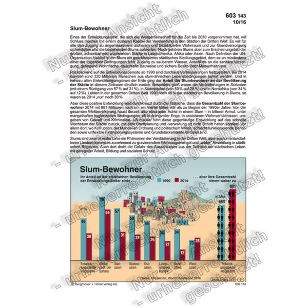 Eines der Entwicklungsziele, die sich die Weltgemeinschaft für die Zeit bis 2030 vorgenommen hat, will Schluss machen mit einem düsteren Kapitel der Verelendung in den Städten der Dritten Welt: Es will für alle den Zugang zu angemessenem, sicherem und bezahlbarem Wohnraum und zur Grundversorgung sicherstellen und die bestehenden Slums aufwerten. Noch gehören Slums aber zum Erscheinungsbild der großen, scheinbar wild wuchernden Städte in Lateinamerika, Afrika oder Asien. Nach Definition der UN-Organisation Habitat ist ein Slum ein geschlossenes städtisches Siedlungsgebiet, dem es an mindestens einer der folgenden Bedingungen fehlt: Zugang zu sauberem Wasser, Anschluss an die sanitäre Versorgung, genügend Wohnfläche, dauerhafte Bauweise und sichere Besitz- oder Mietverhältnisse.