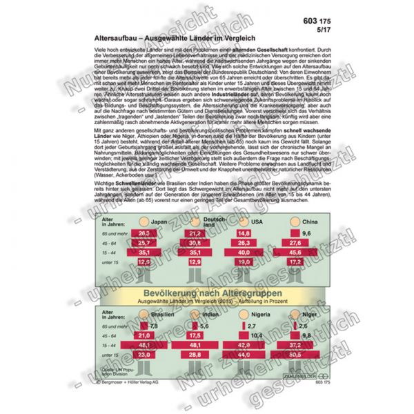 Viele hoch entwickelte Länder sind mit den Problemen einer alternden Gesellschaft konfrontiert. Durch die Verbesserung der allgemeinen Lebensverhältnisse und der medizinischen Versorgung erreichen dort immer mehr Menschen ein hohes Alter, während die nachwachsenden Jahrgänge wegen der sinkenden Geburtenhäufigkeit nur noch schwach besetzt sind. Wie sich solche Entwicklungen auf den Altersaufbau einer Bevölkerung auswirken, zeigt das Beispiel der Bundesrepublik Deutschland: Von deren Einwohnern hat bereits mehr als jeder fünfte die Altersschwelle von 65 Jahren erreicht oder überschritten. Es gibt damit schon weit mehr Menschen im Rentenalter als Kinder unter 15 Jahren und dieses Übergewicht nimmt weiter zu. Knapp zwei Drittel der Bevölkerung stehen im erwerbsfähigen Alter zwischen 15 und 64 Jahren. Ähnliche Altersstrukturen weisen auch andere Industrieländer auf, deren Bevölkerung kaum noch wächst oder sogar schrumpft. Daraus ergeben sich schwerwiegende Zukunftsprobleme im Hinblick auf das Bildungs- und Beschäftigungssystem, die Alterssicherung und die Krankenversorgung, aber auch auf die Nachfrage nach bestimmten Gütern und Dienstleistungen. Vorerst verschiebt sich das Verhältnis zwischen „tragenden“ und „lastenden“ Teilen der Bevölkerung zwar noch langsam, künftig wird aber eine zahlenmäßig rasch abnehmende Aktivgeneration für immer mehr ältere Menschen sorgen müssen.