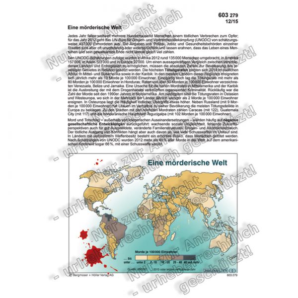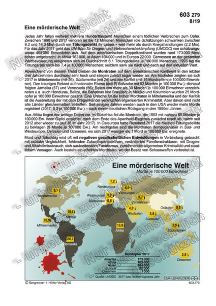 Aus Afrika liegen nur wenige Daten vor. In Südafrika fiel die Mordrate, die 1993 mit nahezu 80 Morden je 100 000 Ew. ihren Gipfel erreichte, nach dem Ende des Apartheid-Regimes zunächst rasch ab, nahm seit 2012 aber wieder zu (auf 36 im Jahr 2017). In Osteuropa hatte Russland 2017 die meisten Tötungsdelikte zu beklagen (9 Morde je 100 000 Ew.). Am niedrigsten sind die Mordraten demgegenüber in Süd- und Westeuropa, Ostasien und Ozeanien, wo sich 2017 weniger als 1 Mord je 100 000 Ew. ereignete.