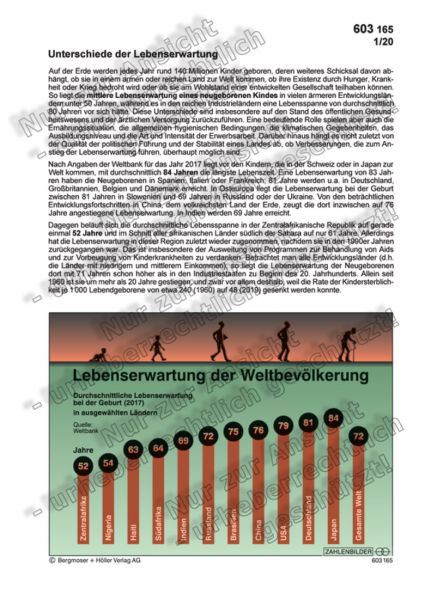 Auf der Erde werden jedes Jahr rund 135 Millionen Kinder geboren, deren weiteres Schicksal davon abhängt, ob sie in einem armen oder reichen Land zur Welt kommen, ob ihre Existenz durch Hunger, Krankheit oder Krieg bedroht wird oder ob sie am Wohlstand einer entwickelten Gesellschaft teilhaben können. So liegt die mittlere Lebenserwartung eines neugeborenen Kindes in vielen ärmeren Entwicklungsländern unter 60 Jahren, während es in den meisten reichen Industrieländern eine Lebensspanne von über 80 Jahren vor sich hätte. Diese Unterschiede sind insbesondere auf den Stand des öffentlichen Gesundheitswesens und der ärztlichen Versorgung zurückzuführen. Eine bedeutende Rolle spielen aber auch die Ernährungssituation, die allgemeinen hygienischen Bedingungen, die klimatischen Gegebenheiten, das Ausbildungsniveau und die Art und Intensität der Erwerbsarbeit. Darüber hinaus hängt es nicht zuletzt von der Qualität der politischen Führung und der Stabilität eines Landes ab, ob Verbesserungen, die zum Anstieg der Lebenserwartung führen, überhaupt möglich sind.