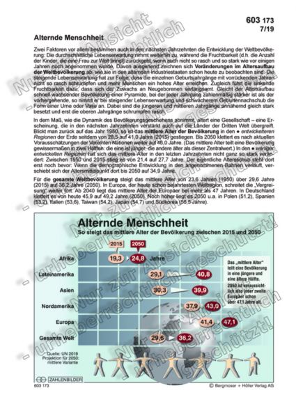 Für die gesamte Weltbevölkerung steigt das mittlere Alter von 23,6 Jahren (1950) über 29,6 Jahre (2015) auf 36,2 Jahre (2050). In Europa, der heute schon bejahrtesten Weltregion, schreitet die „Vergreisung“ weiter fort. Ab 2040 liegt das mittlere Alter der Europäer bei mehr als 47 Jahren. In Deutschland klettert es von heute 45,9 auf 49,2 Jahre (2050). Noch höher liegt es 2050 u.a. in Polen (51,2), Spanien (53,2), Italien (53,6), Taiwan (54,2), Japan (54,7) und Südkorea (56,5 Jahre).