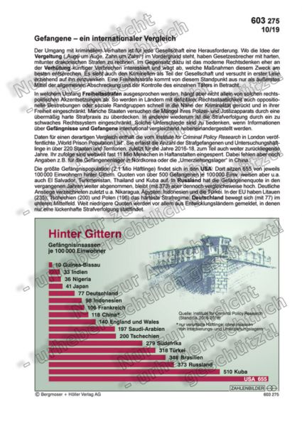 Die größte Gefängnispopulation (2,1 Mio Häftlinge) findet sich in den USA. Dort sitzen 655 von jeweils 100 000 Einwohnern hinter Gittern. Quoten von über 500 Gefangenen je 100 000 Einw. weisen aber u.a. auch El Salvador, Turkmenistan, Thailand und Kuba auf. In Russland hat die Gefangenenquote in den vergangenen Jahren weiter abgenommen, bleibt (mit 373) aber dennoch vergleichsweise hoch. Deutliche Anstiege verzeichneten zuletzt u.a. Nikaragua, Ägypten, Indonesien und die Türkei. In der EU haben Litauen (235), Tschechien (200) und Polen (196) das härteste Strafregime. Deutschland bewegt sich (mit 77) im unteren Mittelfeld. Weit niedrigere Quoten werden vor allem aus Entwicklungsländern gemeldet, in denen nur eine lückenhafte Strafverfolgung stattfindet.