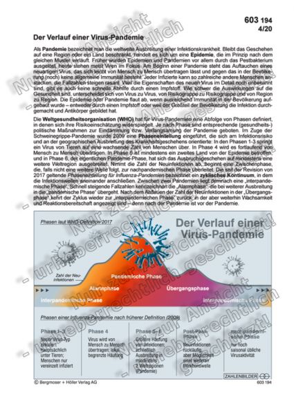 Die Weltgesundheitsorganisation (WHO) hat für Virus-Pandemien eine Abfolge von Phasen definiert, in denen sich ihre Risikoeinschätzung widerspiegelt. Je nach Phase sind entsprechende (gesundheits-) politische Maßnahmen zur Eindämmung bzw. Verlangsamung der Pandemie geboten. Im Zuge der Schweinegrippe-Pandemie wurde 2009 eine Phaseneinteilung eingeführt, die sich am Infektionsrisiko und an der geographischen Ausbreitung des Krankheitsgeschehens orientierte: In den Phasen 1-3 springt ein Virus von Tieren auf eine wachsende Zahl von Menschen über. In Phase 4 wird es fortlaufend von Mensch zu Mensch übertragen. In Phase 5 ist mindestens ein zweites Land von der Epidemie betroffen, und in Phase 6, der eigentlichen Pandemie-Phase, hat sich das Ausbruchsgeschehen auf mindestens eine weitere Weltregion ausgebreitet. Nimmt die Zahl der Neuinfektionen ab, beginnt eine Zwischenphase, die, falls nicht eine weitere Welle folgt, zur nachpandemischen Phase überleitet. Die seit der Revision von 2017 geltende Phaseneinteilung für Influenza-Pandemien bezeichnet ein zyklisches Kontinuum, in dem die Infektionswellen aneinander anschließen. Zwischen zwei Pandemien liegt demnach eine „interpandemische Phase“. Schnell steigende Fallzahlen kennzeichnen die „Alarmphase“, die bei weiterer Ausbreitung in die „pandemische Phase“ übergeht. Nach dem Abflauen der Zahl der Neuinfektionen in der „Übergangsphase“ kehrt der Zyklus wieder zur „interpandemischen Phase“ zurück, in der aber weiterhin Wachsamkeit und Reaktionsbereitschaft angezeigt sind – denn nach der Pandemie ist vor der Pandemie.