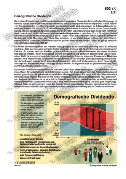 Die meisten Entwicklungs- und Schwellenländer durchlaufen eine Phase des demografischen Übergangs, in dem die vorher hohen Geburtenzahlen sinken und sich auf niedrigerem Niveau einpendeln. Diese Abkehr von der traditionellen Bevölkerungsweise zieht weitreichende Veränderungen im Altersaufbau der jeweiligen Gesellschaft nach sich. Für eine Übergangszeit sinkt der Anteil der Kinder an der Gesamtbevölkerung. Da die Jahrgänge der Alten wegen der begrenzten Lebenserwartung aber meist noch nicht sehr stark besetzt sind, stellen die Menschen im erwerbsfähigen Alter – zwischen 15 und 64 Jahren – einen höheren Anteil an der Bevölkerung als je zuvor. Dieser Anteil schrumpft erst wieder, wenn mit sinkender Sterblichkeit mehr Menschen ein hohes Alter erreichen. In der Zwischenzeit eröffnet sich eine Chance, das betreffende Land wirtschaftlich und sozial ein großes Stück voranzubringen. Wenn es gelingt, erntet es eine „demografische Dividende“.