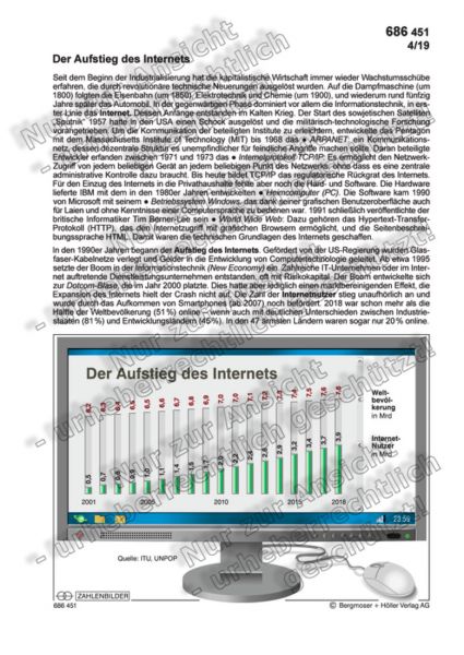 Seit dem Beginn der Industrialisierung hat die kapitalistische Wirtschaft immer wieder Wachstumsschübe erhalten, die von revolutionären technischen Neuerungen ausgelöst wurden. Auf die Dampfmaschine (um 1800) folgten die Eisenbahn (um 1850), Elektrotechnik und Chemie (um 1900), und wiederum grob fünfzig Jahre später das Automobil. Die gegenwärtige Phase ist vor allem durch Informationstechnik dominiert, in erster Linie das Internet. Dessen Anfänge entstanden im Kalten Krieg. Der Start des sowjetischen Satelliten „Sputnik“ 1957 hatte in den USA einen Schock ausgelöst und die militärisch-technologische Forschung vorangetrieben. Um die Kommunikation der beteiligten Institute zu erleichtern, entwickelte das Pentagon mit dem Massachusetts Institute of Technology (MIT) bis 1968 das ● ARPANET: ein Kommunikationsnetz, dessen dezentrale Struktur es unempfindlicher für feindliche Angriffe machen sollte. Daran beteiligte Entwickler erfanden zwischen 1971 und 1973 das ● Internetprotokoll TCP/IP: Es ermöglicht den Netzwerk-Zugriff von jedem beliebigen Gerät an jedem beliebigen Punkt des Netzwerks, ohne dass es eine zentrale administrative Kontrolle dazu braucht. Bis heute bildet TCP/IP das regulatorische Rückgrat des Internets. Für den Einzug des Internets in die Privathaushalte fehlte aber noch die Hard- und Software. Die Hardware lieferte IBM mit dem in den 1980er Jahren entwickelten ● Heimcomputer (PC). Die Software kam 1990 von Microsoft mit seinem ● Betriebssystem Windows, das dank seiner grafischen Benutzeroberfläche auch für Laien und ohne Kenntnisse einer Computersprache zu bedienen war. 1991 schließlich veröffentlichte der britische Informatiker Tim Berner-Lee sein ● World Wide Web: Dazu gehören das Hypertext-Transfer-Protokoll (HTTP), das den Internetzugriff mit grafischen Browsern ermöglicht, und die Seitenbeschreibungssprache HTML. Damit waren die technischen Grundlagen des Internets geschaffen.