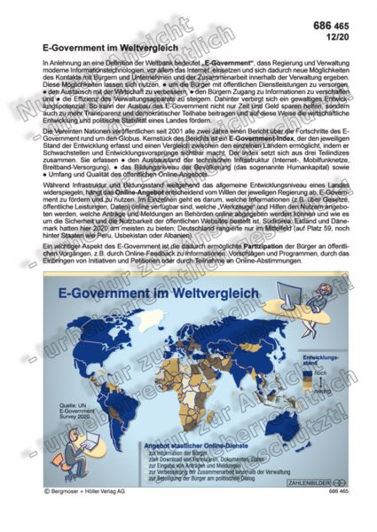 Während Infrastruktur und Bildungsstand weitgehend das allgemeine Entwicklungsniveau eines Landes widerspiegeln, hängt das Online-Angebot entscheidend vom Willen der jeweiligen Regierung ab, E-Government zu fördern und zu nutzen. Im Einzelnen geht es darum, welche Informationen (z.B. über Gesetze, öffentliche Leistungen, Daten) online verfügbar sind, welche „Werkzeuge“ und Hilfen den Nutzern angeboten werden, welche Anträge und Meldungen an Behörden online abgegeben werden können und wie es um die Sicherheit und die Nutzbarkeit der öffentlichen Websites bestellt ist. Südkorea, Estland und Dänemark hatten hier 2020 am meisten zu bieten; Deutschland rangierte nur im Mittelfeld (auf Platz 59, noch hinter Staaten wie Peru, Usbekistan oder Albanien).