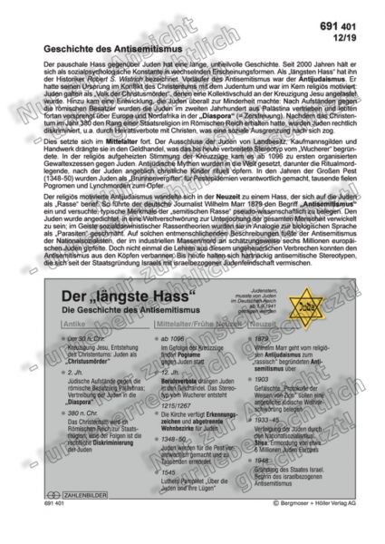 Der religiös motivierte Antijudaismus wandelte sich in der Neuzeit zu einem Hass, der sich auf die Juden als „Rasse“ berief. So führte der deutsche Journalist Wilhelm Marr 1879 den Begriff „Antisemitismus“ ein und versuchte, typische Merkmale der „semitischen Rasse“ pseudo-wissenschaftlich zu belegen. Den Juden wurde angedichtet, in eine Weltverschwörung zur Unterjochung der gesamten Menscheit verwickelt zu sein; im Geiste sozialdarwinistischer Rassentheorien wurden sie in Analogie zur biologischen Sprache als „Parasiten“ geschmäht. Auf solchen entmenschlichenden Beschreibungen fußte der Antisemitismus der Nationalsozialisten, der im industriellen Massenmord an schätzungsweise sechs Millionen europäischen Juden gipfelte. Doch nicht einmal die Lehren aus diesem ungeheuerlichen Verbrechen konnten den Antisemitismus aus den Köpfen verbannen. Bis heute halten sich hartnäckig antisemitische Stereotypen, die sich seit der Staatsgründung Israels mit israelbezogener Judenfeindschaft vermischen.