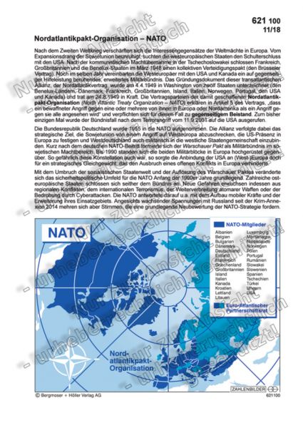 Nach dem Zweiten Weltkrieg verschärften sich die Interessengegensätze der Weltmächte in Europa. Vom Expansionsdrang der Sowjetunion beunruhigt, suchten die westeuropäischen Staaten den Schulterschluss mit den USA. Nach der kommunistischen Machtübernahme in der Tschechoslowakei schlossen Frankreich, Großbritannien und die Benelux-Staaten im März 1948 einen kollektiven Verteidigungspakt, den Brüsseler Vertrag. Noch im selben Jahr vereinbarten die Westeuropäer mit den USA und Kanada ein auf gegenseitiger Hilfeleistung beruhendes, erweitertes Militärbündnis. Das Gründungsdokument dieser transatlantischen Allianz, der Nordatlantikvertrag, wurde am 4.4.1949 in Washington von zwölf Staaten unterzeichnet (den Benelux-Ländern, Dänemark, Frankreich, Großbritannien, Island, Italien, Norwegen, Portugal, den USA und Kanada) und trat am 24.8.1949 in Kraft. Die Vertragsparteien der damit geschaffenen Nordatlantikpakt- Organisation (North Atlantic Treaty Organization – NATO) erklären in Artikel 5 des Vertrags, „dass ein bewaffneter Angriff gegen eine oder mehrere von ihnen in Europa oder Nordamerika als ein Angriff gegen sie alle angesehen wird“ und verpflichten sich für diesen Fall zu gegenseitigem Beistand. Zum bisher einzigen Mal wurde der Bündnisfall nach dem Terrorangriff vom 11.9.2011 auf die USA ausgerufen.