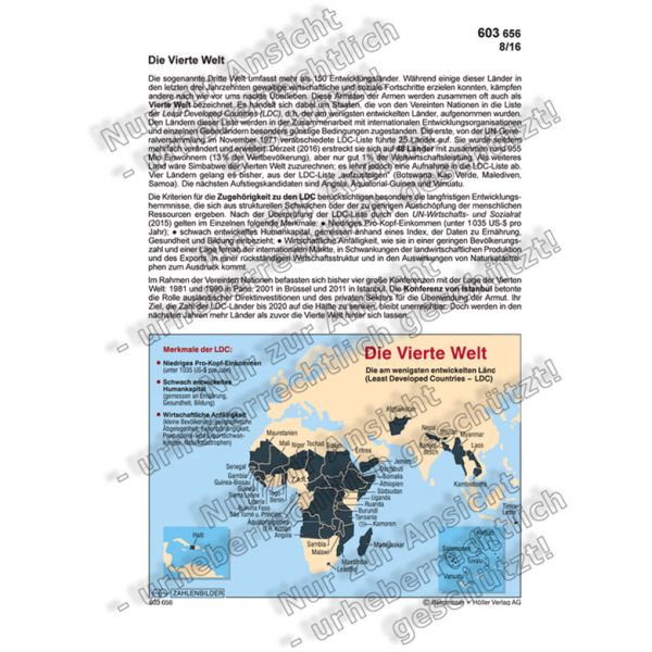 Einige Länder der ehemaligen Dritten Welt machten im Lauf der letzten drei bis vier Jahrzehnte gewaltige wirtschaftliche und soziale Fortschritte, andere kämpfen dagegen nach wie vor ums reine Überleben. Diese Ärmsten der Armen werden zusammen oft auch als Vierte Welt bezeichnet. Es handelt sich dabei um die Staaten, die von den Vereinten Nationen in die Liste der Least Developed Countries (LDC), d.h. der am wenigsten entwickelten Länder, aufgenommen wurden. Den Ländern dieser Liste werden in der Zusammenarbeit mit internationalen Entwicklungsorganisationen und einzelnen Geberländern besonders günstige Bedingungen zugestanden. Die erste, von der UN-Generalversammlung im November 1971 verabschiedete LDC-Liste führte 25 Länder auf. Sie wurde seitdem mehrfach verändert, indem neue Länder hinzukamen oder andere sie nach einer günstigen Entwicklung verlassen konnten. Anfang 2025 erstreckt sie sich auf 44 Länder mit zusammen rund 1,2 Milliarden Einwohnern (14 % der Weltbevölkerung), aber nur gut 1 % der Weltwirtschaftsleistung. Acht Ländern gelang es bisher, aus der LDC-Liste „aufzusteigen“: Botswana (1994), Kap Verde (2007), den Malediven (2011), Samoa (2014), Äquatorial-Guinea (2017), Vanuatu (2020), Bhutan (2023) sowie São Tomé und Principe (2024). Die nächsten Aufstiegskandidaten sind Bangladesch, Laos, Nepal (2026) und die Salomonen (2027).