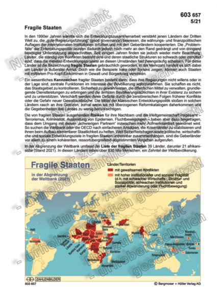 In der Abgrenzung der Weltbank umfasst die Liste der fragilen Staaten 39 Länder, darunter 21 afrikanische (Stand 2021). In diesen Ländern leben über 830 Mio Menschen, ein Zehntel der Weltbevölkerung.