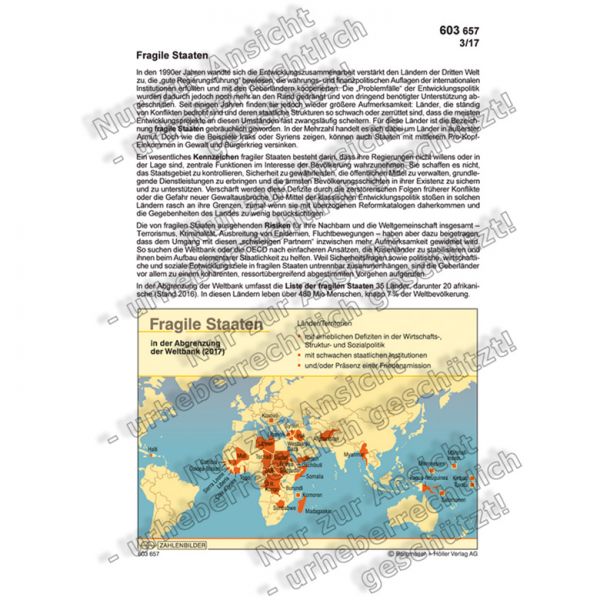 In den 1990er Jahren wandte sich die Entwicklungszusammenarbeit verstärkt jenen Ländern der Dritten Welt zu, die „gute Regierungsführung“ (good governance) bewiesen, die währungs- und finanzpolitischen Auflagen der internationalen Institutionen erfüllten und mit den Geberländern kooperierten. Die „Problemfälle“ der Entwicklungspolitik wurden dadurch jedoch noch mehr an den Rand gedrängt und von dringend benötigter Unterstützung abgeschnitten. Seit einigen Jahren finden sie jedoch wieder mehr Beachtung: Länder, die ständig von Konflikten bedroht sind und deren staatliche Strukturen so schwach oder zerrüttet sind, dass die meisten Entwicklungsprojekte an diesen Umständen fast zwangsläufig scheitern. Für diese Länder ist die Bezeichnung fragile Staaten gebräuchlich geworden. In der Mehrzahl handelt es sich dabei um Länder in äußerster Armut. Doch wie die Beispiele Iraks oder Syriens zeigen, können auch Staaten mit mittlerem Pro-Kopf-Einkommen in Gewalt und Bürgerkrieg versinken.