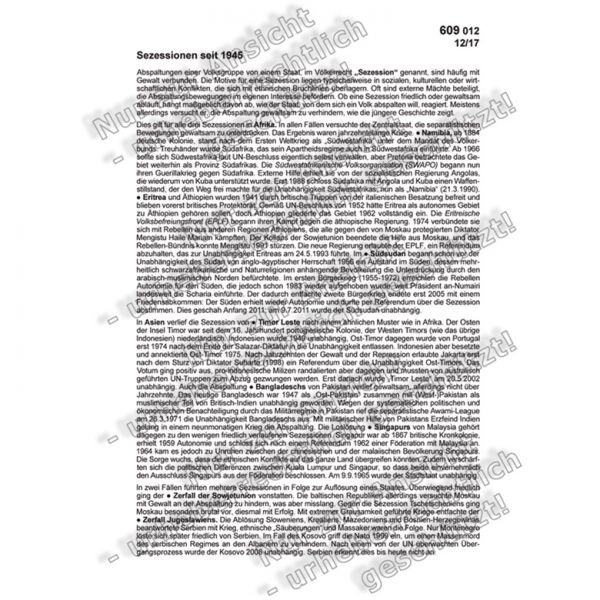 Abspaltungen einer Volksgruppe von einem Staat, im Völkerrecht „Sezession“ genannt, sind häufig mit Gewalt verbunden. Die Motive für eine Sezession liegen typischerweise in sozi ...