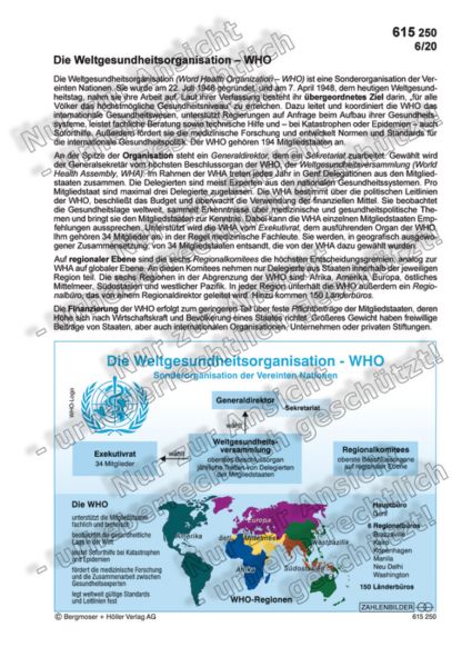 Die Weltgesundheitsorganisation (Word Health Organization – WHO) ist eine Sonderorganisation der Vereinten Nationen. Sie wurde am 22. Juli 1946 gegründet, und am 7. April 1948, dem heutigen Weltgesundheitstag, nahm sie ihre Arbeit auf. Laut ihrer Verfassung besteht ihr übergeordnetes Ziel darin, „für alle Völker das höchstmögliche Gesundheitsniveau“ zu erreichen. Dazu leitet und koordiniert die WHO das internationale Gesundheitswesen, unterstützt Regierungen auf Anfrage beim Aufbau ihrer Gesundheitssysteme, leistet fachliche Beratung sowie technische Hilfe und – bei Katastrophen oder Epidemien – auch Soforthilfe. Außerdem fördert sie die medizinische Forschung und entwickelt Normen und Standards für die internationale Gesundheitspolitik. Der WHO gehören 194 Mitgliedstaaten an.