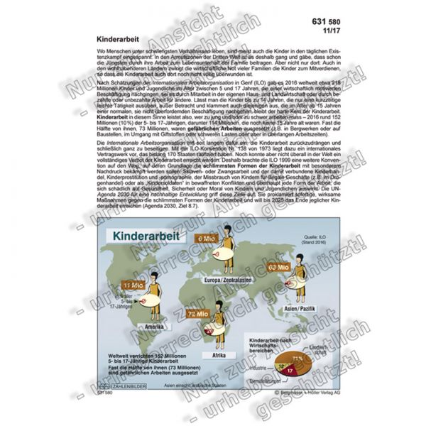 Nach Schätzungen der Internationalen Arbeitsorganisation in Genf (ILO) gab es 2024 weltweit rund 138 Millionen Kinder und Jugendliche zwischen 5 und 17 Jahren (knapp 8% der Bevölkerung dieses Alters), die einer wirtschaftlich motivierten Beschäftigung nachgingen, sei es durch Mitarbeit in der eigenen Hausund Landwirtschaft oder durch bezahlte oder unbezahlte Arbeit für andere. Nicht mitgerechnet sind dabei Kinder, die nur eine kurzzeitige leichte Tätigkeit ausüben oder mit 15-17 Jahren einer normalen, sie nicht überfordernden Beschäftigung nachgehen. Kinderarbeit in dieser Abgrenzung leistet also, wer zu jung und/oder zu schwer arbeiten muss. Von den 138 Mio arbeitenden Kindern waren 79 Millionen erst 5 bis 11 Jahre alt und 28 Millionen zwischen 12 und 14 Jahren. Insgesamt 54 Millionen waren gefährlichen Arbeiten ausgesetzt (z.B. in Bergwerken oder auf Baustellen, im Umgang mit Giftstoffen oder schweren Lasten oder aber in überlangen Arbeitszeiten).