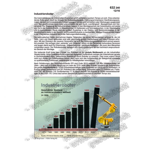 Nach Schätzungen des Branchenverbands IFR sind Ende 2016 weltweit 1,82 Mio Industrieroboter am Werk – allein seit 2010 eine Steigerung um mehr als 70 %! Jeder dritte Roboter arbeitet in der Autoindustrie. Die größte Roboterdichte je 10000 Industriebeschäftigte weist Südkorea auf (2015 mit 531 Einheiten). In Europa belegt Deutschland (mit 301 Robotern) den ersten Rang. Schweden setzt 212 Roboter ein, Frankreich 127, die Schweiz 119, Großbritannien 71. In Japan werkeln 305 Roboter je 10000 Industriebeschäftigte, in den USA 176. China baut seinen Bestand an Industrierobotern in raschem Tempo aus.