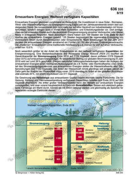 Die Gewinnung von Heizenergie aus erneuerbaren Quellen macht ebenfalls rasche Fortschritte. Die für Heizung, Kühlung und Warmwasserbereitung verfügbaren Kapazitäten beliefen sich Ende 2018 auf 826 Gigawatt (thermisch). Als dritter großer Verbrauchssektor kann der Verkehr auf erneuerbare Energien zurückgreifen, und zwar vorerst hauptsächlich in Form von Biokraftstoffen. Setzen sich elektrisch getriebene Fahrzeuge am Markt durch, können sie mit Strom versorgt werden und gleichzeitig als Speicher für regenerativ erzeugte Elektrizität dienen.