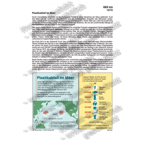 Das wegen seiner Beständigkeit und Formbarkeit für unzählige Produkte verwendete Plastikmaterial ist in aller Regel nicht biologisch abbaubar. Gelangt es ins Meer, zerfällt es unter dem Einfluss der Sonnenstrahlung und der Wellenbewegung in immer kleinere Teile, die von Plankton, Fischen, Seevögeln, Reptilien und Meeressäugetieren aufgenommen werden und so mitsamt der ihnen anhaftenden Giftstoffe in den Nahrungskreislauf gelangen. Problematisch sind aber auch größere Plastikgegenstände wie Schaumstoffplatten, Fässer, Netze oder Boote, mit denen Mikroben, Algen, Fische oder wirbellose Tiere in fremde Lebensräume eingeschleppt werden können.