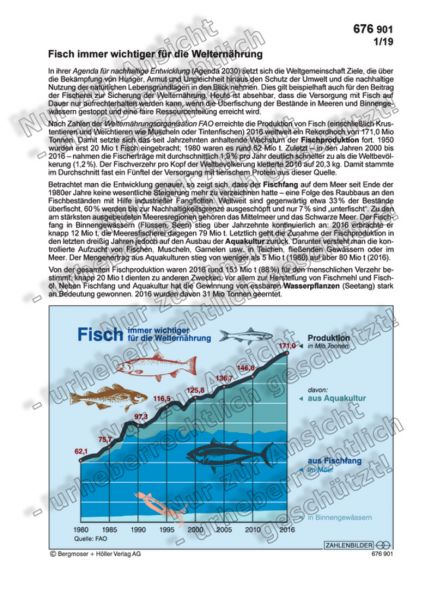 Nach Zahlen der Welternährungsorganisation FAO erreichte die Produktion von Fisch (einschließlich Krustentieren und Weichtieren wie Muscheln oder Tintenfischen) 2016 weltweit ein Rekordhoch von 171,0 Mio Tonnen. Damit setzte sich das seit Jahrzehnten anhaltende Wachstum der Fischproduktion fort. 1950 wurden erst 20 Mio t Fisch eingebracht; 1980 waren es rund 62 Mio t. Zuletzt – in den Jahren 2000 bis 2016 – nahmen die Fischerträge mit durchschnittlich 1,9 % pro Jahr deutlich schneller zu als die Weltbevölkerung (1,2 %). Der Fischverzehr pro Kopf der Weltbevölkerung kletterte 2016 auf 20,3 kg. Damit stammte im Durchschnitt fast ein Fünftel der Versorgung mit tierischem Protein aus dieser Quelle.