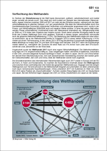 Die Gravitationszentren des internationalen Warenhandels lagen auch 2017 wieder in Europa (mit der EU als Kern), in Asien und Nordamerika. So machten die Exportströme innerhalb dieser drei Weltregionen und zwischen ihnen wertmäßig über drei Viertel des gesamten Welthandels aus. Dagegen sind die übrigen Weltregionen zum Teil erst schwach in die Weltwirtschaft integriert und unterhalten vor allem untereinander noch kaum nennenswerte Exportbeziehungen. China unterstrich 2017 mit Ausfuhren im Wert von 2 263 Mrd US-$ seine Position als „Exportweltmeister“. Auf dem zweiten Rang folgten die USA vor Deutschland und Japan. Bei den Einfuhren lagen dagegen die USA vor China, Deutschland und Japan an der Spitze.