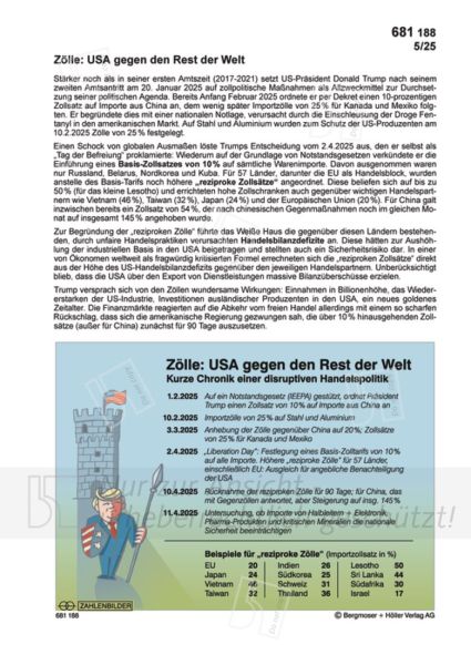 Stärker noch als in seiner ersten Amtszeit (2017-2021) setzt US-Präsident Donald Trump nach seinem zweiten Amtsantritt am 20. Januar 2025 auf zollpolitische Maßnahmen als Allzweckmittel zur Durchsetzung seiner politischen Agenda. Bereits Anfang Februar 2025 ordnete er per Dekret einen 10-prozentigen Zollsatz auf Importe aus China an, dem wenig später Importzölle von 25% für Kanada und Mexiko folgten. Er begründete dies mit einer nationalen Notlage, verursacht durch die Einschleusung der Droge Fentanyl in den amerikanischen Markt. Auf Stahl und Aluminium wurden zum Schutz der US-Produzenten am 10.2.2025 Zölle von 25% festgelegt.