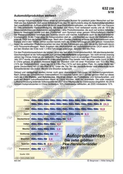 Für das Produktionswachstum der letzten Jahre war fast allein China verantwortlich. Mit atemberaubender Geschwindigkeit ist die Volksrepublik zum größten Herstellerland aufgestiegen. Vor nicht einmal zwanzig Jahren lag Chinas Anteil an der weltweiten Pkw-Produktion noch im einstelligen Prozentbereich, doch im Jahr 2017 wurde von den weltweit 84,8 Mio produzierten Pkw bereits mehr als jeder vierte (rund 24 Mio) in China gebaut. In großem Abstand folgte der Standort USA mit einer Produktion von 10,9 Mio Pkw (13 % der Weltproduktion), Japan lag mit 8,3 Mio Pkw (10 %) auf dem dritten Platz. An vierter Stelle rangierte Deutschland mit 5,6 Mio Pkw (8 %). Unter die Top Ten der Herstellerländer sind mittlerweile auch Schwellenländer wie Indien, Mexiko und Brasilien aufgerückt.